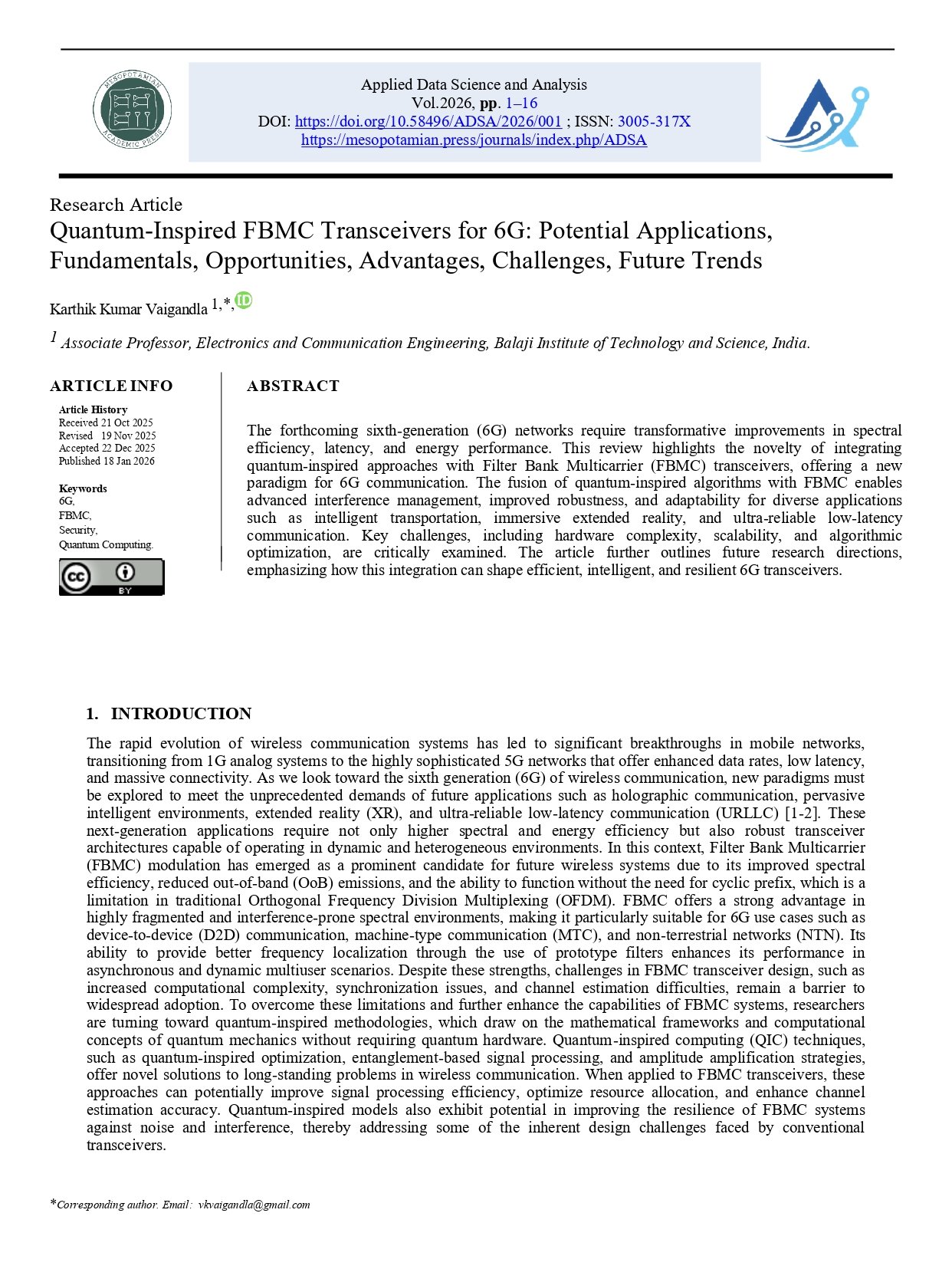 Quantum-Inspired FBMC Transceivers for 6G: Potential Applications, Fundamentals, Opportunities, Advantages, Challenges, Future Trends (Karthik Kumar Vaigandla , Trans.). (2026). Applied Data Science and Analysis, 2026, 1-16. https://doi.org/10.58496/ADSA/2026/001