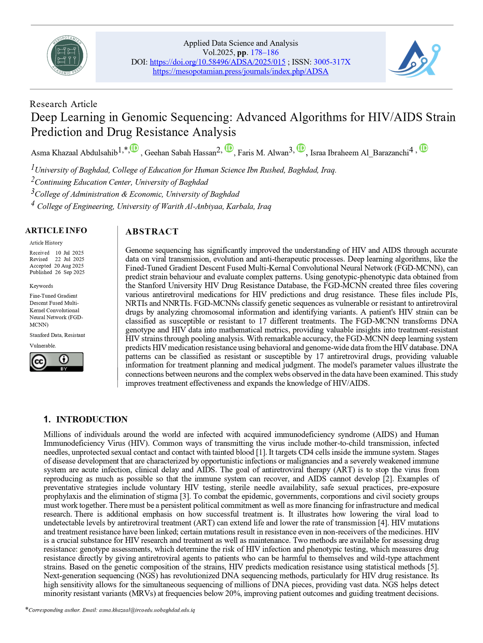 Deep Learning in Genomic Sequencing: Advanced Algorithms for HIV/AIDS Strain Prediction and Drug Resistance Analysis (A. K. . Abdulsahib, G. S. . Hassan, F. M. . Alwan, & I. I. Al_Barazanchi , Trans.). (2025). Applied Data Science and Analysis, 2025, 178-186. https://doi.org/10.58496/ADSA/2025/015