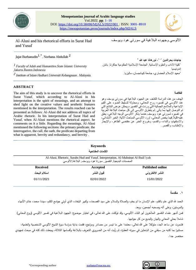 Al-Alusi and his rhetorical efforts in Surat Hud and Yusuf (J. Burhanudin & N. Abdullah , Trans.). (2022). Mesopotamian Journal of Arabic Language Studies, 2022, 1-16. https://doi.org/10.58496/MJALS/2022/001