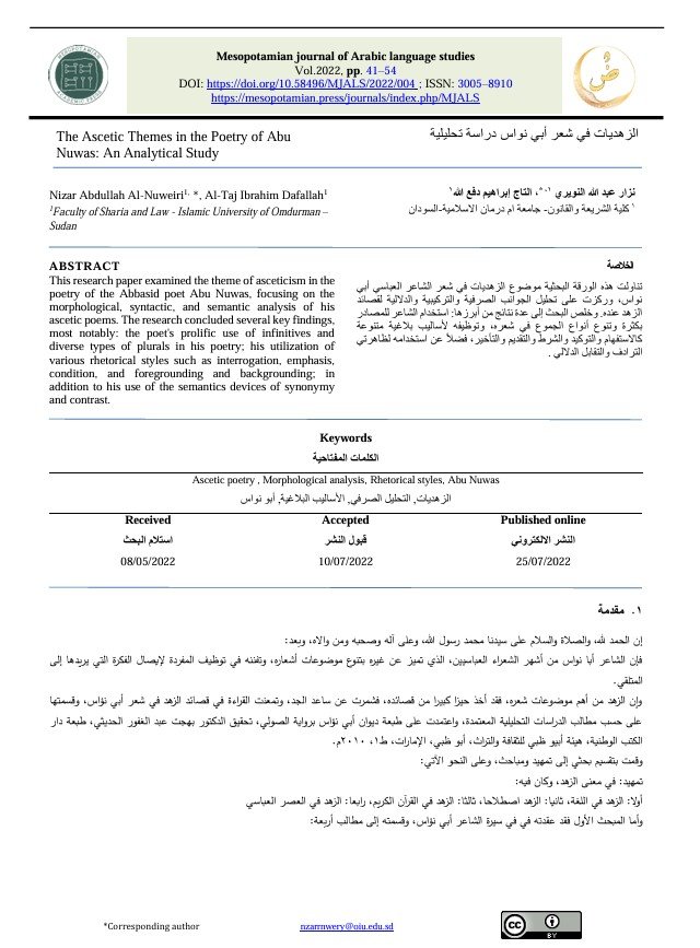 The Ascetic Themes in the Poetry of Abu Nuwas: An Analytical Study (Nizar Abdullah Al-Nuweiri & Al-Taj Ibrahim Dafallah , Trans.). (2022). Mesopotamian Journal of Arabic Language Studies, 2022, 41-54. https://doi.org/10.58496/MJALS/2022/004