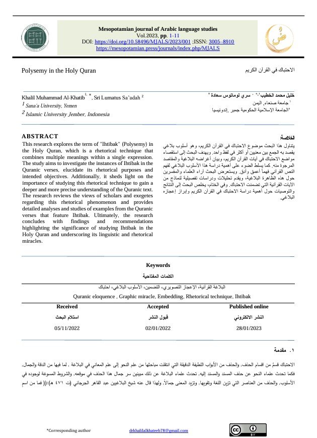 Polysemy in the Holy Quran (K. M. Al-Khatib & S. L. Sa’adah , Trans.). (2023). Mesopotamian Journal of Arabic Language Studies, 2023, 1-11. https://doi.org/10.58496/MJALS/2023/001