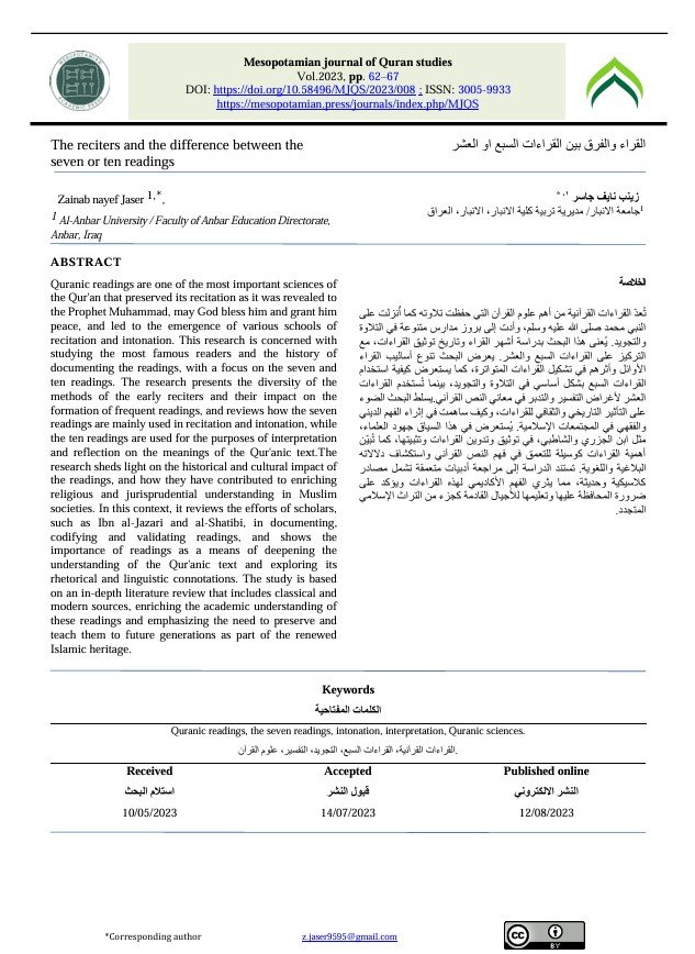 The reciters and the difference between the seven or ten readings (Z. nayef Jaser , Trans.). (2023). Mesopotamian Journal of Quran Studies, 2023, 62-68. https://doi.org/10.58496/MJQS/2023/008