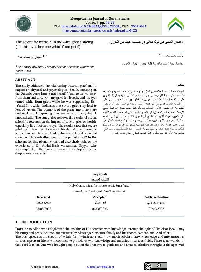 This study addressed the relationship between grief and its impact on physical and psychological health, focusing on the Quranic verse from Surat Yusuf: "And he turned away from them and said, "Oh, my grief for Joseph, and his eyes turned white from grief, while he was suppressing [it]" (Yusuf 84), which indicates that severe grief may lead to loss of vision. The opinions of the great interpreters are reviewed in interpreting the verse and analyzing it linguistically. The study also reviews the results of recent scientific research on the impact of severe grief on health, especially its effect on the eye. The results show that severe grief can lead to increased levels of the hormone adrenaline, which in turn leads to increased blood sugar and cataracts. The study discusses the interpretations of Muslim scholars for this phenomenon, and also sheds light on the experience of Dr. Abdul Basit Muhammad Sayyid, who was inspired by the Qur’anic verse to develop a medical drop to treat cataracts.