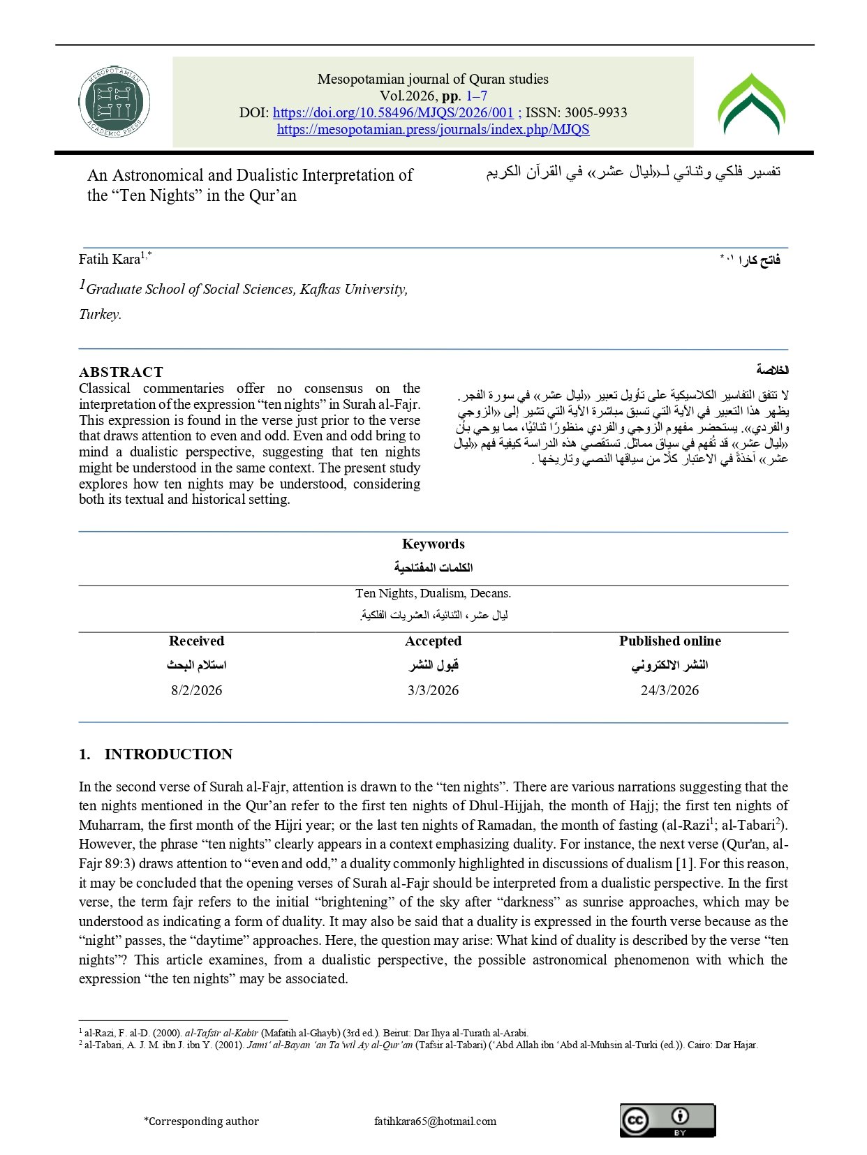An Astronomical and Dualistic Interpretation of the “Ten Nights” in the Qur’an